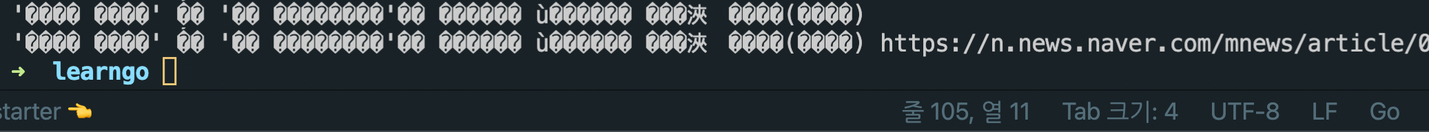 네이버 기사 목록에서 가져온 기사 제목(string)을 앞, 뒤의 띄어쓰기를 제거 한 다음 fmt.print 하는 코드다.