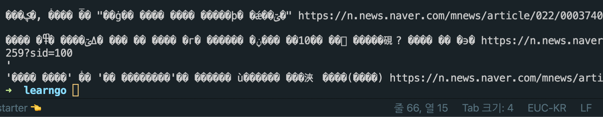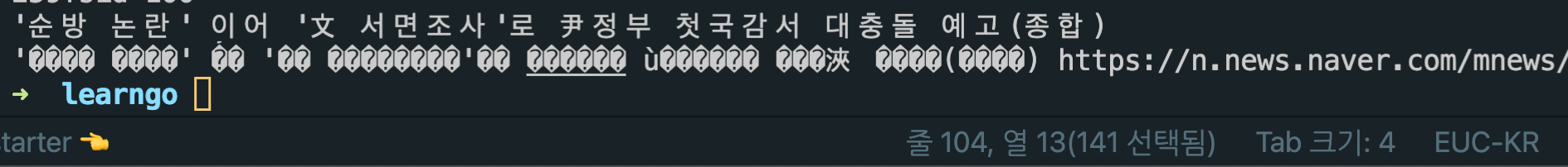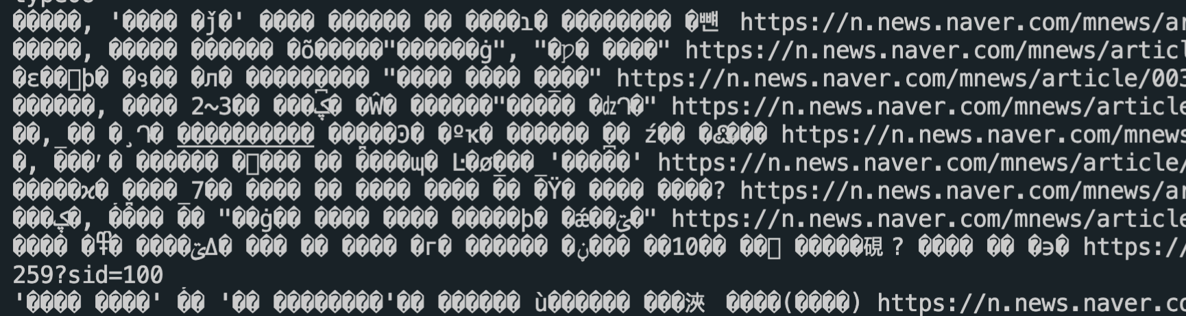 페이지를 긁는 것 까진 좋으나… 뭐 때문인지 VScode 상에서는 가져온 한글이 죄다 깨져서 나왔다