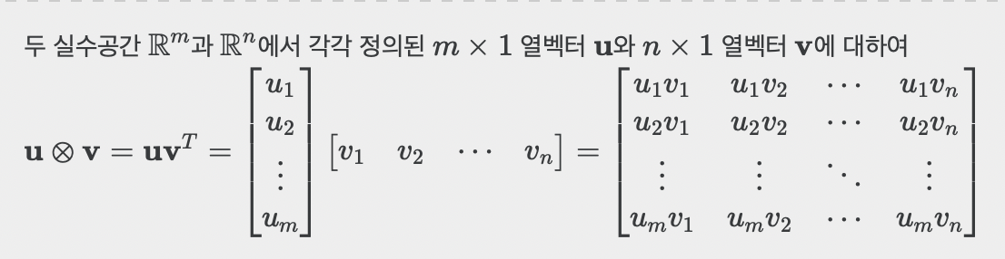 → 두 벡터 간의 텐서 곱을 의미 (결괏값으로 스칼라나 벡터가 아닌 행렬 도출)