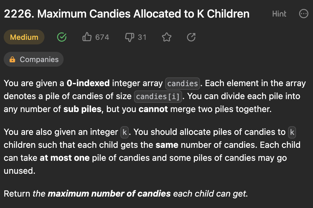모든 candies를 더했을 때 사람수와 같다면 딱 1개씩만 배분 가능 (위 binary Search 알고리즘을 탈 필요가 없다)