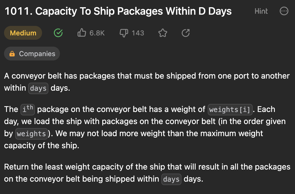 def shipWithinDays(self, weights: List[int], days: int) -> int:
