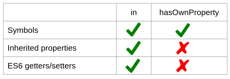 - hasOwnProperty의 경우, es6의 getter, setter 여부는 false로 반환