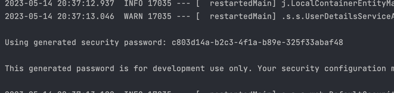 정상 작동시 아직은 지정된 유저 정보가 없기에 스프링부트가 알아서 임시로 생성해 준다.