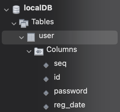 local에 깔려있는 mysql에 임시로 DB(localDB)와 table(user)을 생성해 준다.