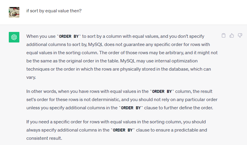 1. https://dba.stackexchange.com/questions/283460/does-mysql-order-by-guarantees-to-give-the-same-order-for-the-same-query-every