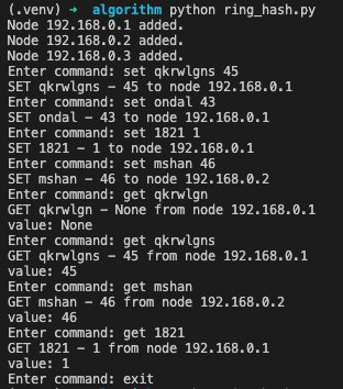- ring: 해시링을 나타내는 딕셔너너리입니다. key는 해시값, value는 서버 노드입니다.