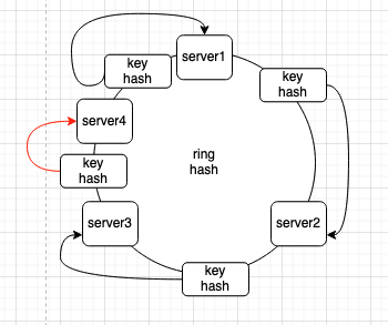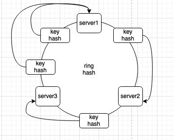 key값도 해싱하여 원형에 배치하고, key값이 위치한 곳에서 시계방향으로 가장 가까운 서버를 선택합니다.