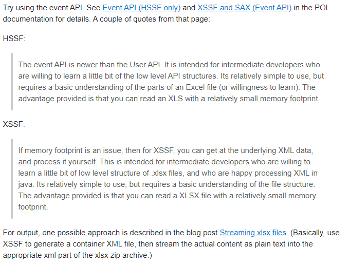 XSSF + Sax를 이용해 reading 하는 방법이 있다고 나와있다.
