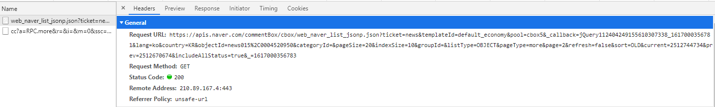 url = "https://apis.naver.com/commentBox/cbox/web_naver_list_jsonp.json?ticket=news&templateId=default_society&pool=cbox5&lang=ko&country=KR&objectId=news119%2C0002479801&categoryId=&pageSize=200&indexSize=10&groupId=&listType=OBJECT&pageType=all&page=2&initialize=true&userType=&useAltSort=true&replyPageSize=20&sort=old&includeAllStatus=true"