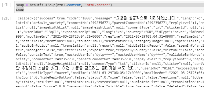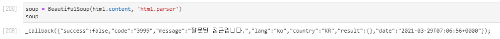 _callback()으로 쌓여서 돌아왔다. 원하는 부분만 뽑으려면 key-value 접근이 편한 json값으로 변환해야 하는데 저부분이 골치아프다.