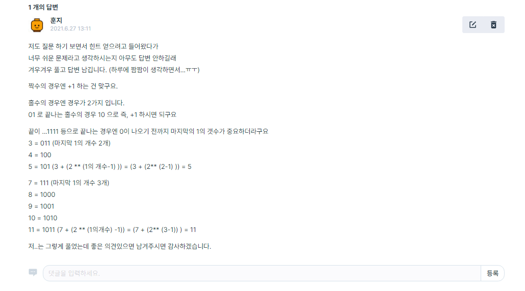 - f(2) = 3 입니다. 다음 표와 같이 2보다 큰 수들 중에서 비트가 다른 지점이 2개 이하이면서 제일 작은 수가 3이기 때문입니다.