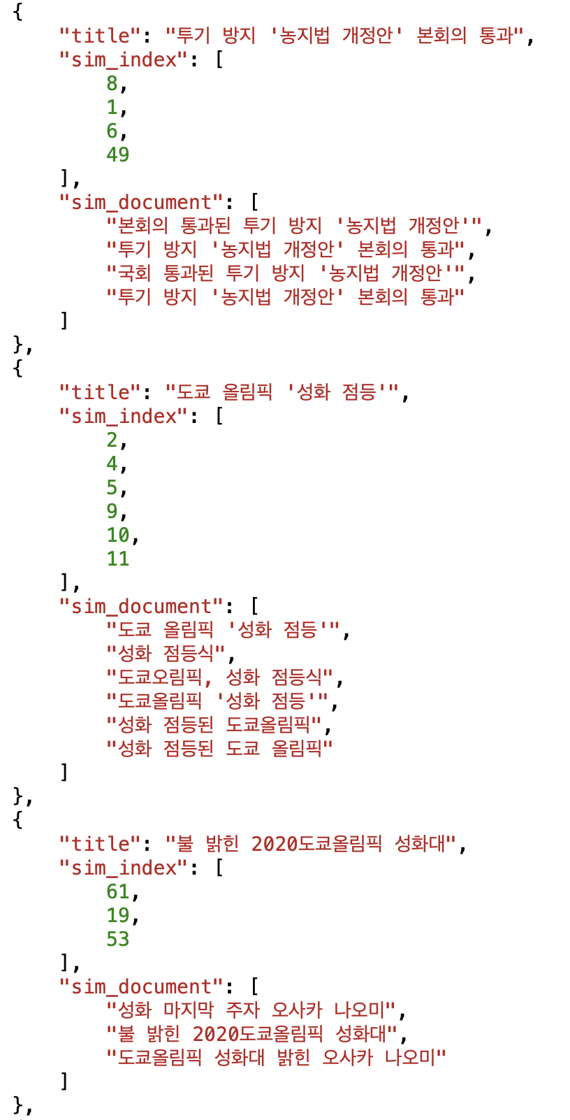 중간에 2번행의 경우 "도쿄 올림픽 '성화 점등' 기사와 비슷한 문서로