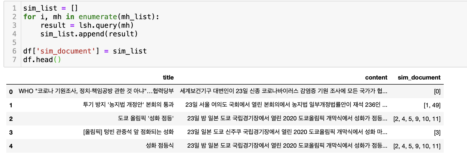 sim_list = [] # 각 문서별 해당 문서와 비슷한 문서가 for i, mh in enumerate(mh_list): result = lsh.query(mh) sim_list.append(result) df['sim_document'] = sim_list # 문서별 비슷한 문서 index를 dataframe에 추가 시켜주자 df.head()