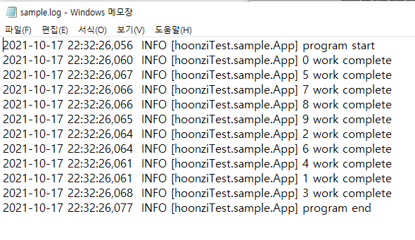 eclipse 내 실행시에는 sample.log에 정상적으로 작성됐지만, executable jar 파일로 만들고 cmd에서 실행했을땐 파일에 로그가 기록이 안되는 문제가 있었는데