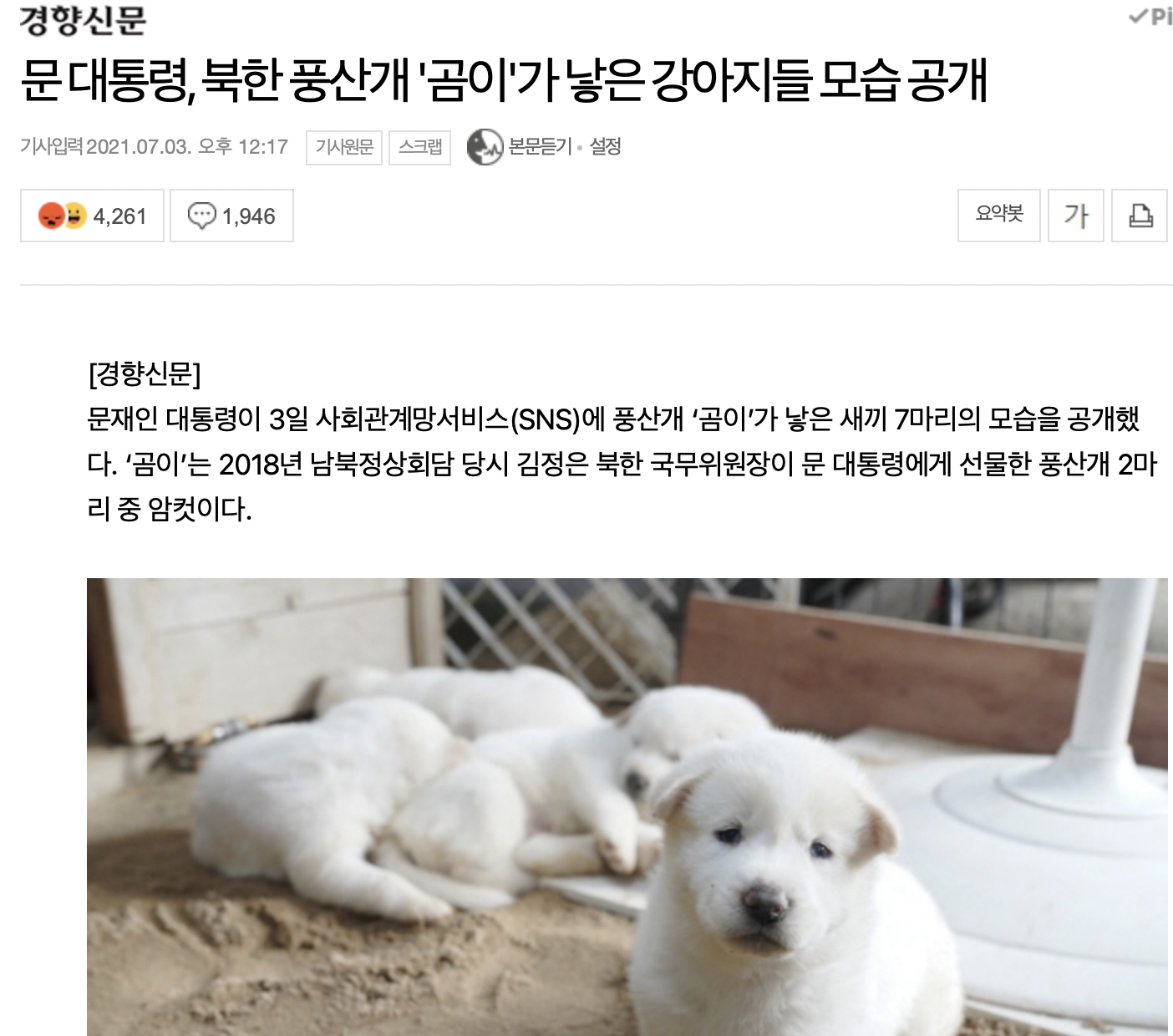 [경향신문] 문재인 대통령이 3일 사회관계망서비스(SNS)에 풍산개 ‘곰이’가 낳은 새끼 7마리의 모습을 공개했다. ‘곰이’는 2018년 남북정상회담 당시 김정은 북한 국무위원장이 문 대통령에게