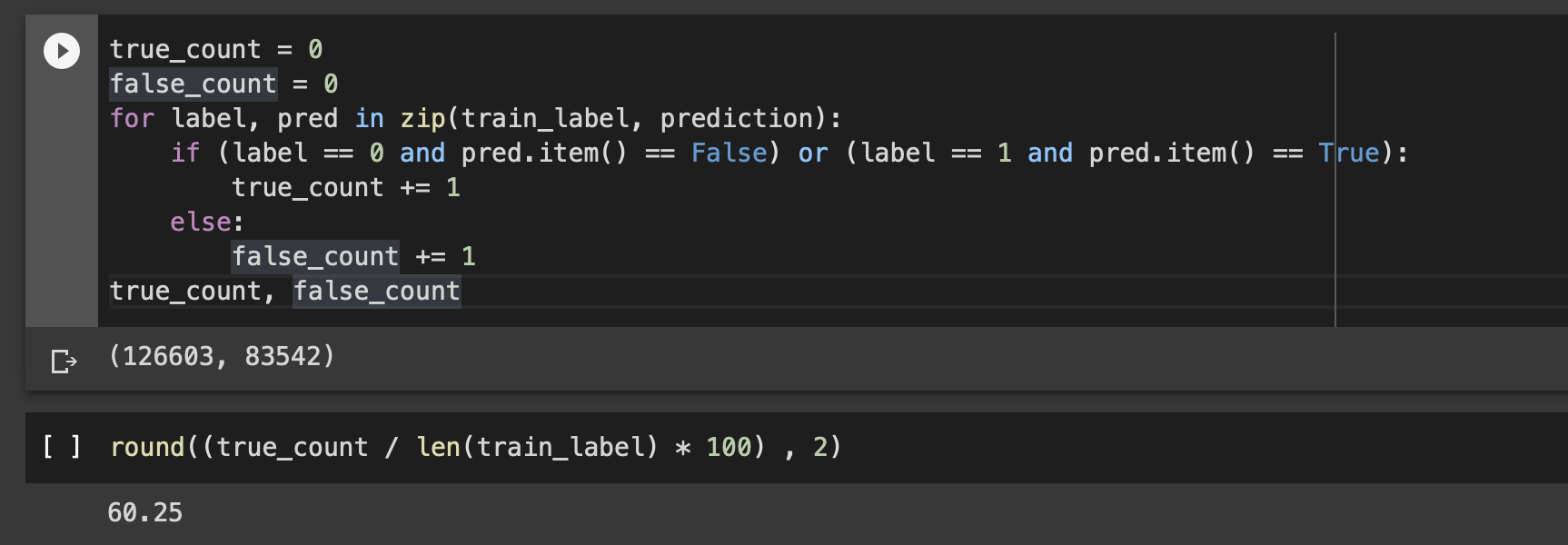 역시 60%... 랜덤으로 고르는 결과를 50%라고 보니, 랜덤으로 고른것과 다를 바 없는 것이다.